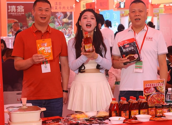 走进贵州展区,首先映入眼帘的便是满眼的 “贵州元素”—— 展位布置融入了苗族银饰、布依族蜡染等民族文化符号,色彩鲜艳又充满地域特色,让人仿佛瞬间穿越到贵州。而更吸引人的,是空气中弥漫的酸辣香气,循着香味走去,便能看到三大特色火锅锅底在锅中沸腾,鲜红的酸汤、橙红的糟辣、金黄的豆米,色泽诱人,让人垂涎欲滴。